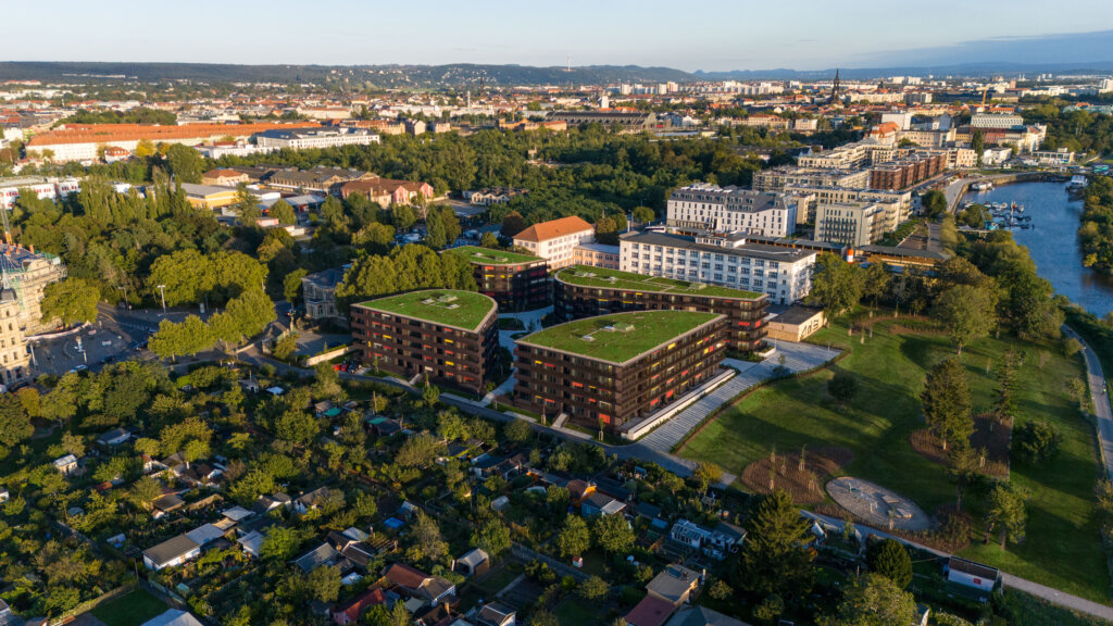 Das Projekt Marina Garden Dresden besticht durch seine einzigartige Architektur. Diese fügt sich nahtlos zwischen die ruhigen Elbwiesen und die lebhafte Leipziger Straße. Die Architekten von BARCODE Architects aus Rotterdam setzten mit ihrem Entwurf auf organisch geschwungene Formen, die das Gebäude harmonisch in die städtische Umgebung integrieren. Die detaillierte Umsetzung des Bebauungsplans erfolgte durch die Architekten Knerer und Lang, die dem Projekt eine klare und moderne Formensprache verliehen.